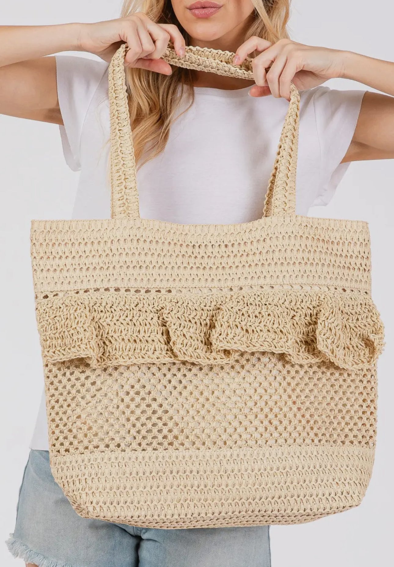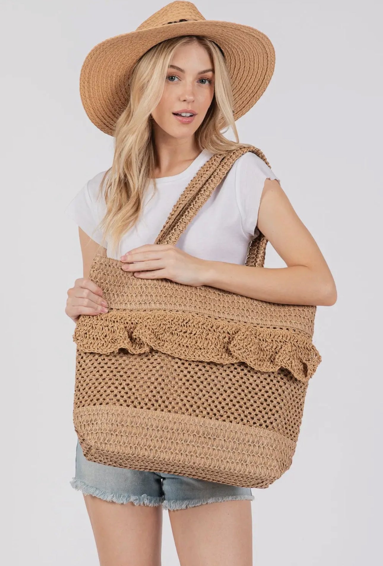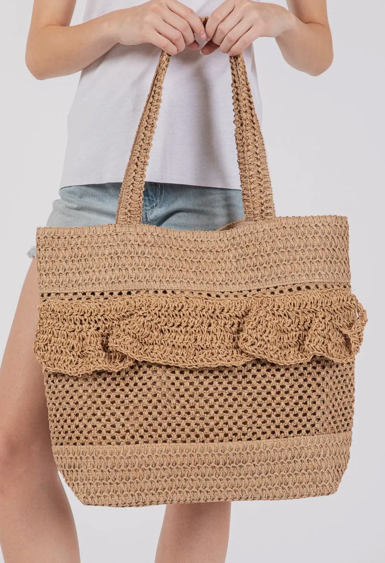This tote bag adds a touch of whimsy and charm to any outfit with its ruffle detail and crochet straw design. Perfect for carrying all your essentials, this bag is both practical and stylish. Make a statement with the MBO272 Ruffle Detail Crochet Straw Tote Bag.