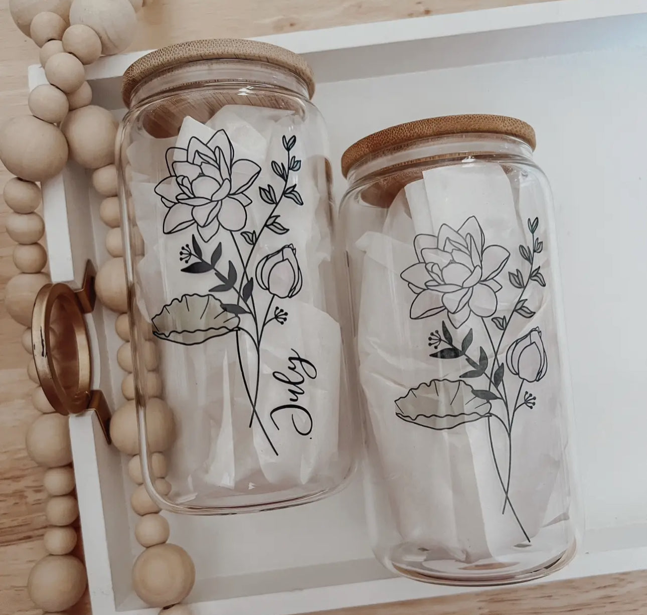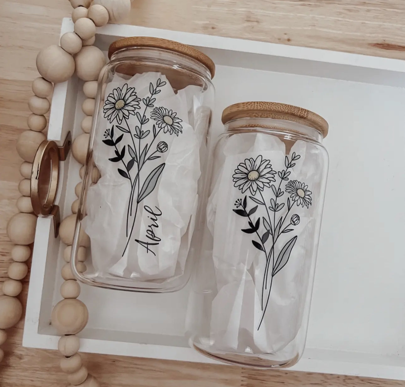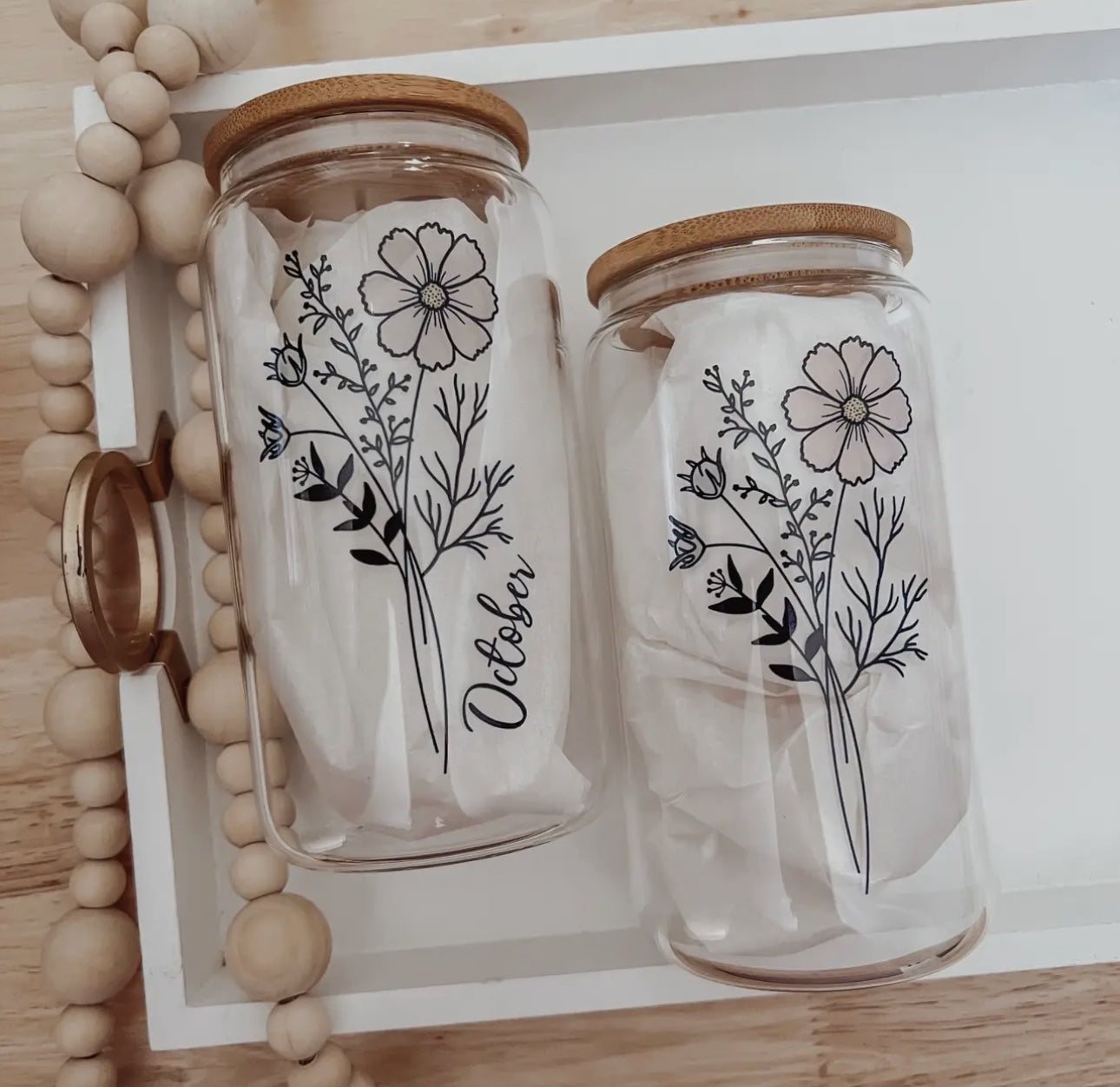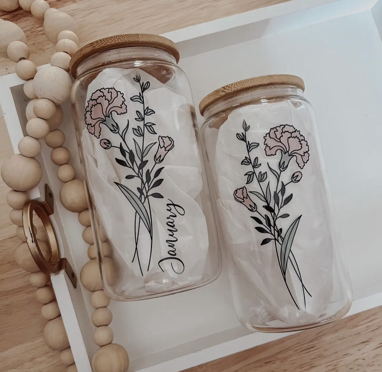 This 16 oz Glass is perfect for iced coffee or a fun cocktail. The glass does NOT have the birth month on the design-flower only!