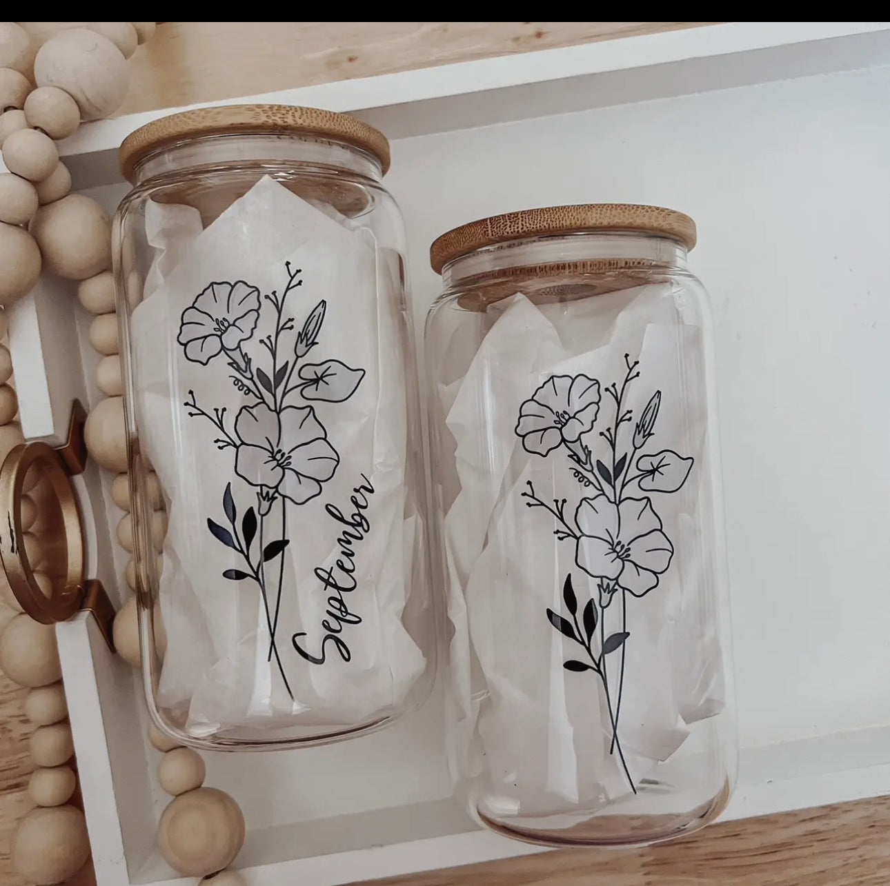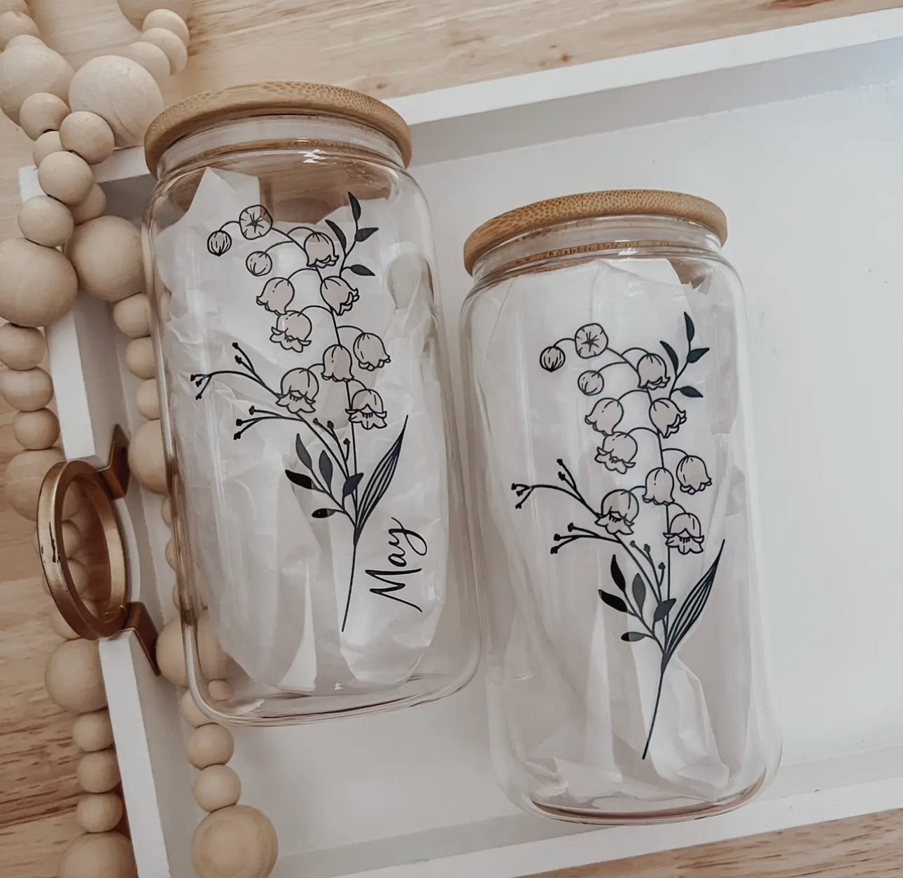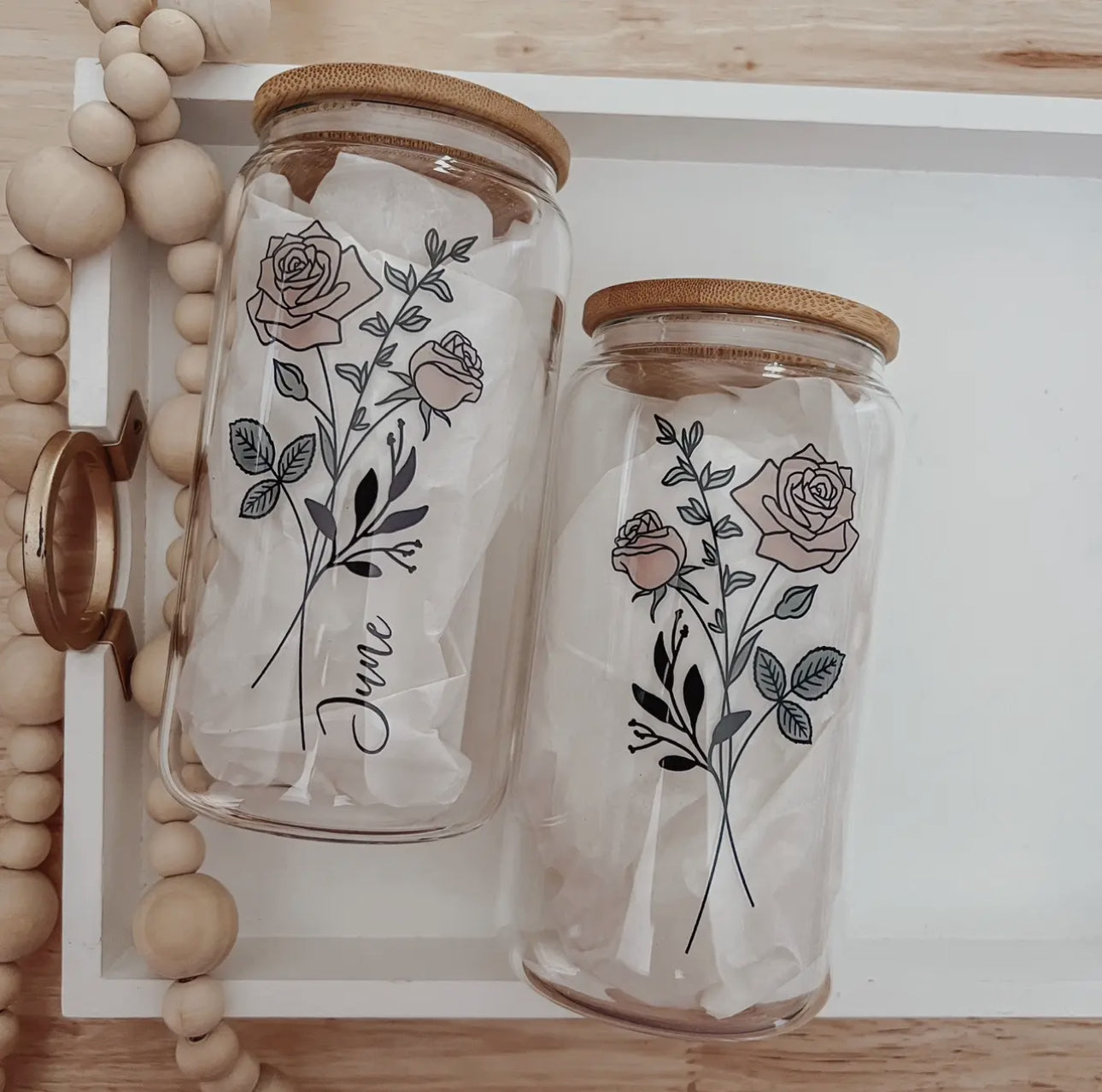 This 16 oz Glass is perfect for iced coffee or a fun cocktail. The glass does NOT have the birth month on the design-flower only!
