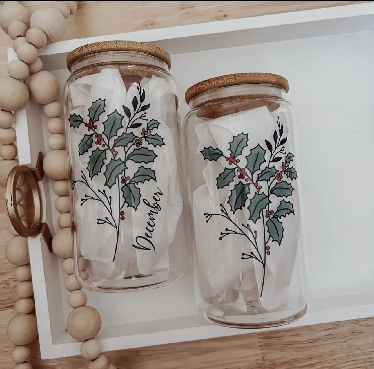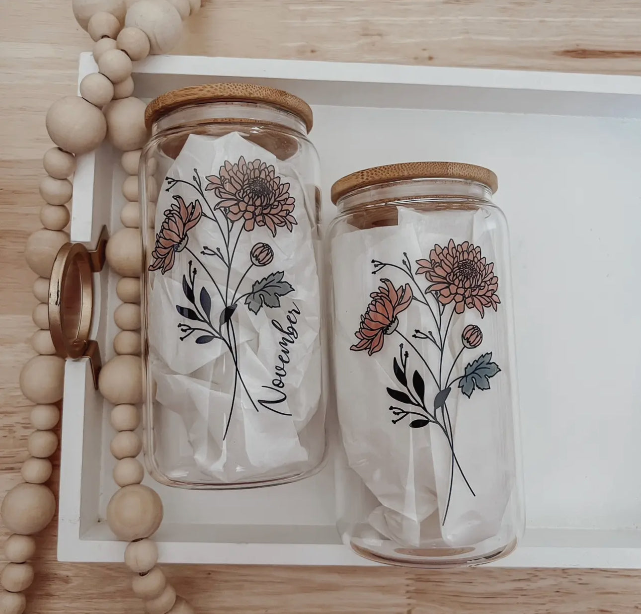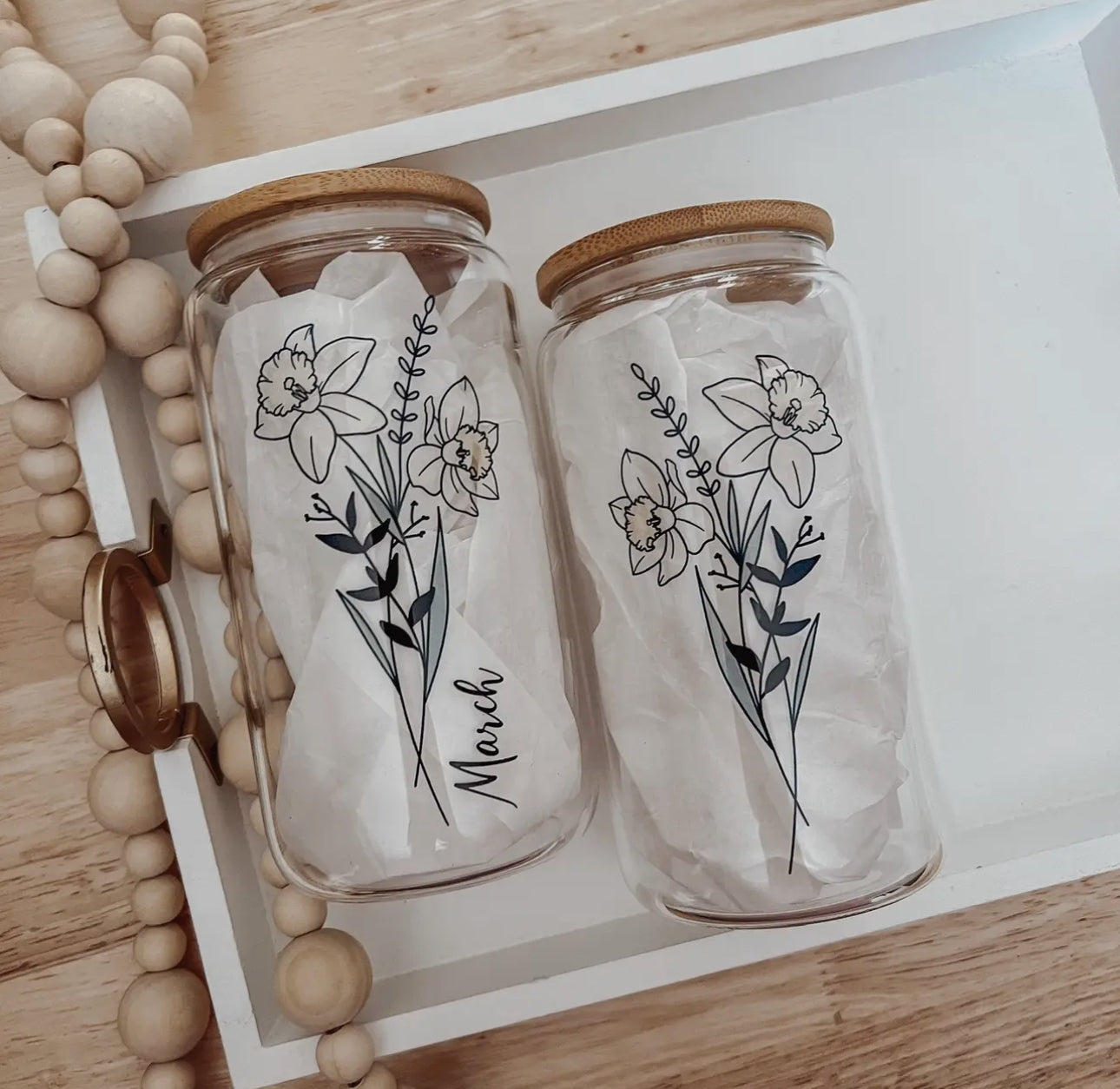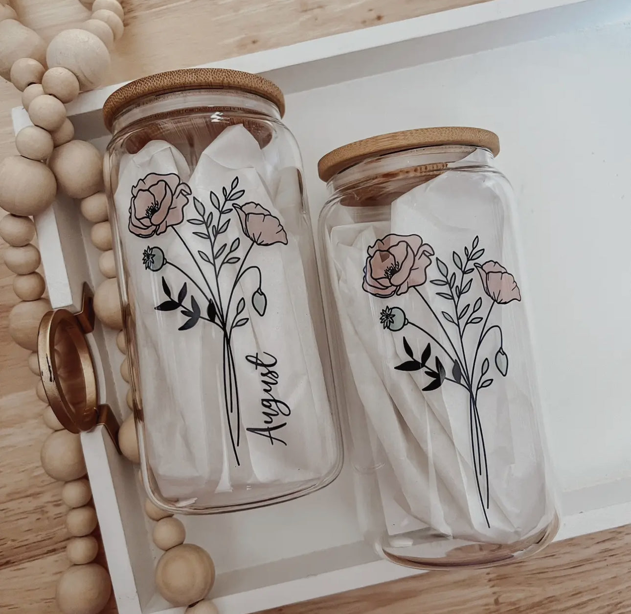 This 16 oz Glass is perfect for iced coffee or a fun cocktail. The glass does NOT have the birth month on the design-flower only!
