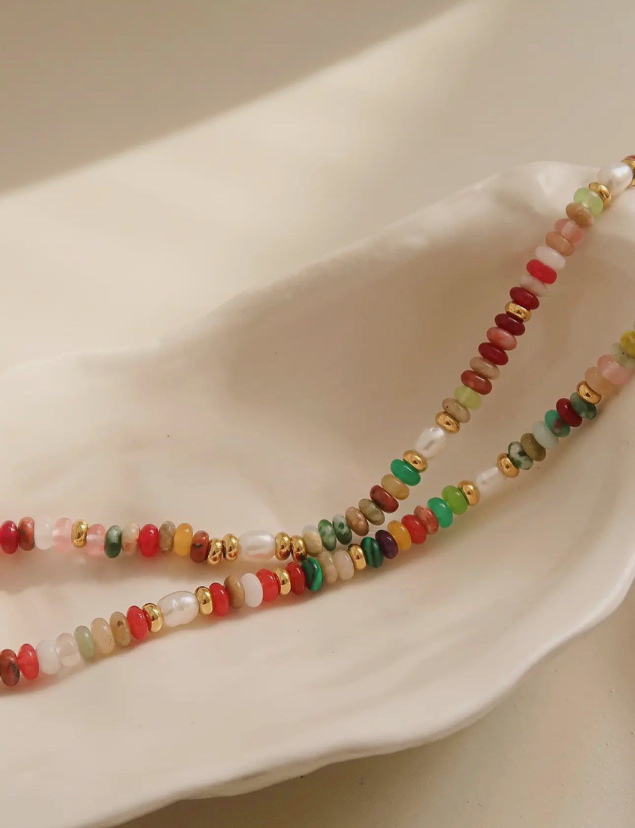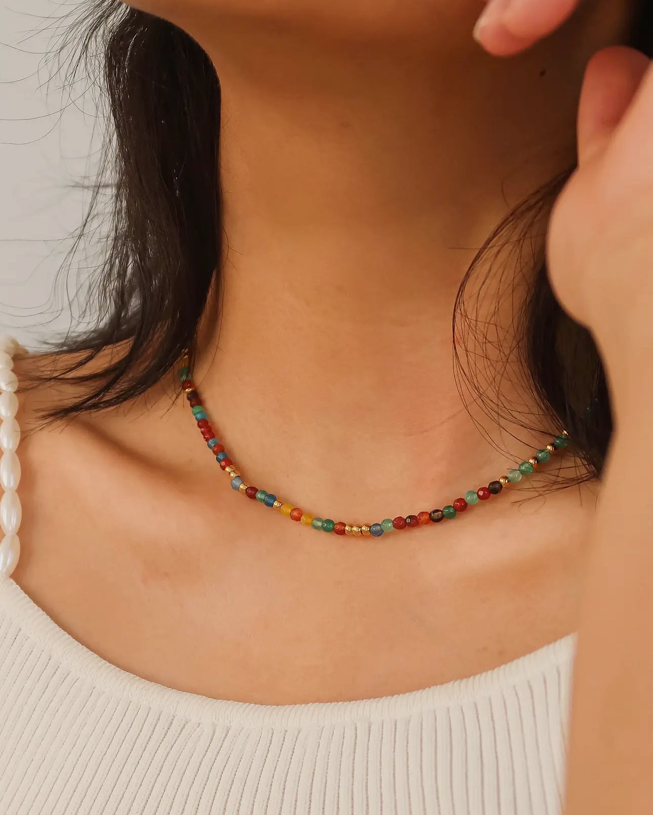Adorned with many colorful beads this necklace matches almost anything. Layer it with other necklaces or wear it alone - either way it's a showstopper!